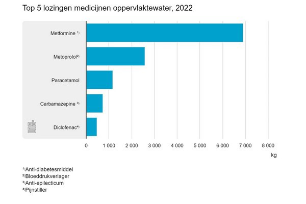 Door bevolkingsgroei en vergrijzing neemt het gebruik van medicijnen en de lozing van medicijnresten langzaam toe. Via apotheken werd in 2018 alleen al circa 1,9 miljoen kilogram werkzame stof per jaar voorgeschreven. Het gebruik van medicijnen zorgt ervoor dat medicijnresten via het toilet in het rioolwater terechtkomen. In totaal ging het in 2022 om circa 1,4 miljoen kilogram per jaar, waarvan de helft bestaat uit laxeermiddelen zoals Macrogol en Lactulose. Metformine, een anti-diabetesmiddel, heeft daarna met bijna 320 duizend kilogram de hoogste bijdrage.
