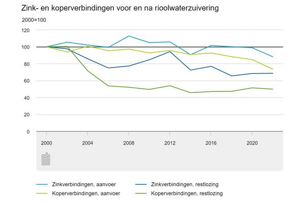 In 2022 waren de restlozingen vanuit rioolwaterzuivering voor zink (69 duizend kilogram) en koper (9 duizend kilogram) respectievelijk 2 procent en 10 procent lager dan in 2021. De zuiveringsrendementen van zink en koper schommelen de laatste jaren rond de 83 procent respectievelijk 93 procent.