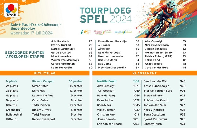 Mariëlle Bosch staat, net als Tadej Pogačar in Frankrijk, nog altijd aan de leiding in het algemeen klassement. Of dat zo blijft, is nog wel de vraag. Over de kansen van de Sloveen is men inmiddels vrij zeker, maar of Mariëlle ook aan kop blijft staan? De sprintkoningin van het Takii Tourploegspel moet nog enkele bergetappes overleven.