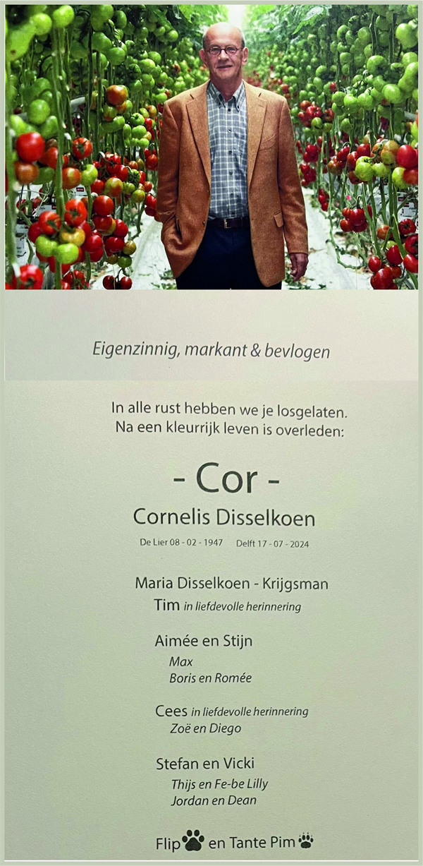 Eigenzinnig, markant en bevlogen, zo luidt de introductie van de rouwadvertentie van Cor Disselkoen. Cor overleed op 17 juli op 77-jarige leeftijd.