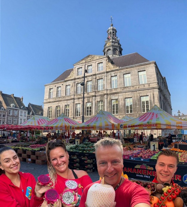 Tholen – Het swingt op de markt in Maastricht in de gigantische zelfbedieningskraam van Bananenboxer. Gangmakers zijn de familie Vroegop, die al sinds 1942 op de markt in Maastricht aan het 'boxen' zijn met AGF. "Iedereen op weg met een glimlach, dat is het doel," zegt Hennie Vroegop, derde generatie. Dat doen ze met een mix van scherpe aanbiedingen en, heel belangrijk, humor. "Het gaat om het totaalplaatje, we prikkelen alle zintuigen."