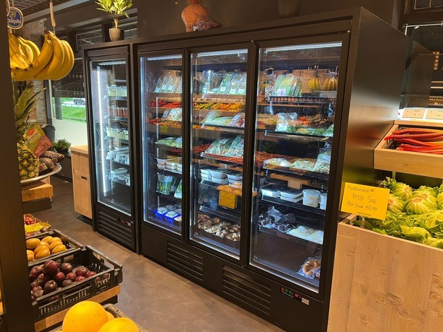 Een ruim assortiment kant-en-klare maaltijden, rauwkosten, salades, desserts, vruchtensappen en zuivel worden fraai gepresenteerd in de koelmeubelen