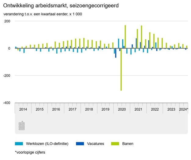 Het aantal vacatures nam in het tweede kwartaal van 2024 af met 10 duizend en het aantal werklozen daalde licht, met 3 duizend. De arbeidsmarkt werd hierdoor iets minder krap. Met 108 vacatures per 100 werklozen is de spanning echter nog steeds hoog. Het aantal banen nam opnieuw toe (+22 duizend). Dat blijkt uit nieuwe cijfers van het CBS.
