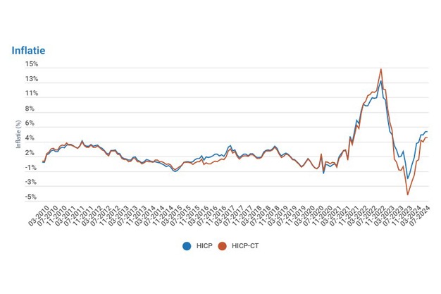 De Belgische inflatie volgens de Europees geharmoniseerde consumptieprijsindex (HICP) blijft in juli stabiel met 5,4%, net zoals in juni, zo meldt Statbel. De kerninflatie (inflatie zonder energie en onbewerkte levensmiddelen) bedraagt in juli 3,6% ten opzichte van 3,5% in juni. De inflatie volgens de consumptieprijsindex (CPI) voor de maand juli bedroeg 3,6% ten opzichte van 3,7% in juni.