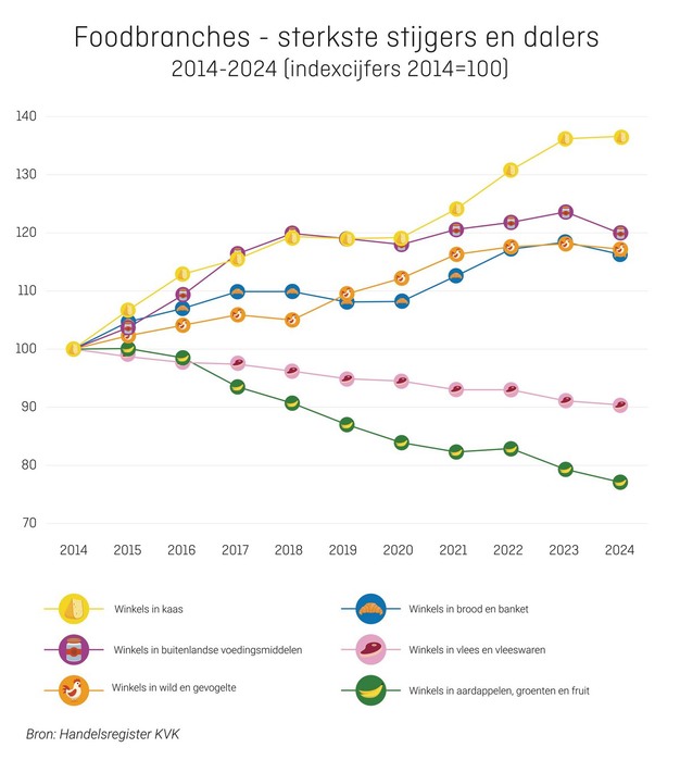 Ondanks de toename van het aantal supermarkten (+14%) en het aanbod van deze winkels, is er ook een toename van food-speciaalzaken. Tussen 2014 en 2024 was er een toename van 2,4% in het aantal vestigingen te zien, zo blijkt uit cijfers van de Kamer van Koophandel. Helaas gelden deze cijfers niet voor AGF-speciaalzaken (-23%) en slagers (-10%). Vooral kaas (+37%) en buitenlandse voedingsmiddelen (+20%) worden steeds meer via speciaalzaken aangeboden, maar ook winkels in brood en banket (+16%) en wild en gevogelte (+17%) zijn de afgelopen tien jaar toegenomen. In absolute zin gaat het inclusief supermarkten om een groei van iets meer dan 1200 vestigingen (van 22.100 naar 23.300).