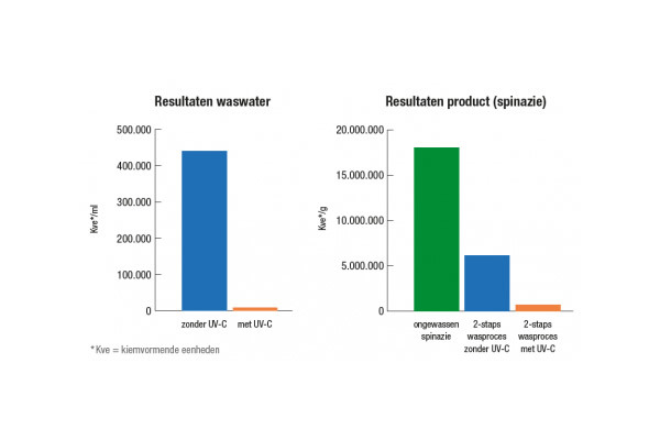 Het microbiologisch schoner waswater heeft ook een duidelijk positief effect op het gewassen eindproduct. Een reductie van circa 1,5 log (circa 96%) is gemeten bij een 2-staps wasproces met alleen in de tweede wasser UV-C. Zonder de toepassing van UV-C is de reductie niet meer dan ongeveer 65%.