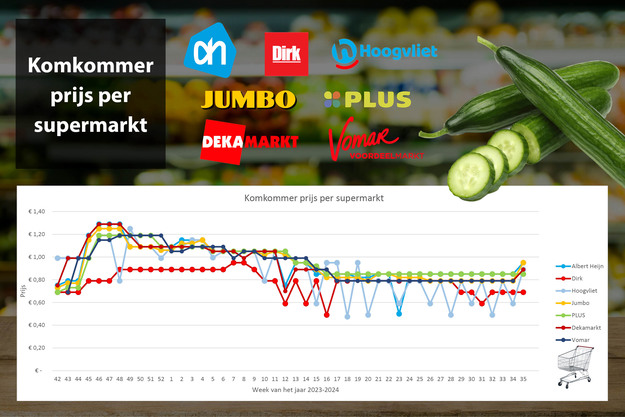De zeer hoge klokprijzen voor komkommer leiden in week 35 tot prijsverhogingen bij de meeste supermarkten die de AGF-monitor volgt. Jumbo verhoogt maar liefst met 16 cent en matcht de prijs van AH, 95 eurocent per komkommer. Daarmee zijn deze twee landelijke supermarkten 10 cent duurder dan PLUS die de prijs gelijk houdt op 85 cent. Dirk blijft 69 cent per komkommer rekenen en doet dat al sinds week 29.