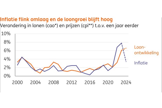 De gemiddelde loonstijging voor 2024 (6,6%) toornt ruimschoots uit boven de gemiddelde prijsstijging (3,4%) uit, volgens de meest recente cijfers van het Centraal Planbureau (CPB). We moeten zelfs bijna een halve eeuw terug (naar 1977) voor een vergelijkbaar positief verschil tussen loonstijging en inflatie. Tegelijkertijd heeft deze historische statistiek natuurlijk ook een keerzijde: de afgelopen paar jaar waren de rollen nog omgedraaid, met 2022 als historisch dieptepunt.