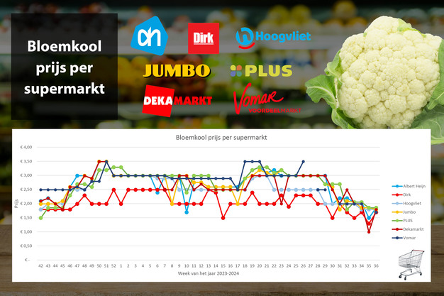 In week 35 pasten de supermarkten de bloemkoolprijs fors naar beneden aan en ontstonden grote verschillen, in week 36 kruipen de prijzen naar elkaar toe. Hoogvliet is door een aanbieding de goedkoopste, 1,49 euro per stuk. Dirk en Vomar liggen daar net boven met 1,69 euro per stuk. Bloemkool bij AH en Plus zijn het duurste met 1,85 euro per stuk.