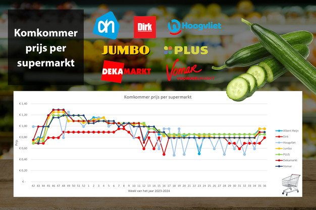 Met uitzondering van Dirk verhoogden de supermarkt hun komkommerprijs in week 35, maar in week 36 verhoogt ook Dirk de vaste prijs, er komt 10 cent bij waardoor deze uitkomt op 79 cent per komkommer. Het prijsverschil met de anderen blijft minstens 10 cent.