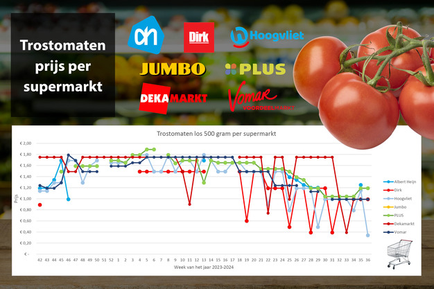 Losse trostomaten lijken een aantrekkelijk stuntproduct. In week 36 komt Hoogvliet met een zeer diepe aanbieding van 34 cent per 500 gram losse tomaten. Albert Heijn heeft in week 36 geen losse trostomaten in het online assortiment.