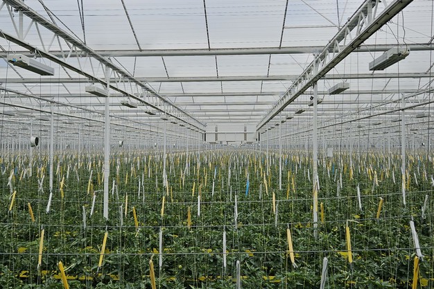 Eerder dit jaar ging Technokas aan de slag voor twee kassen van Red Harvest, waarin tijdens de nieuwbouw de luchtbehandelingskasten boven het middenpad werden geïnstalleerd. Het gaat hier om de kassen nr. 5 en nr. 6 aan de Tussenweg in Middenmeer. Daar heeft Red Harvest inmiddels zes dezelfde 'blokken' gerealiseerd van kassen die per stuk ongeveer 7,5 hectare groot zijn. De kassen zijn 255 meter breed, waardoor de slurven boven de teeltpaden circa 123 meter lang zijn. In kas nr. 5 is de installatie eerder dit jaar al afgerond, zodat de tomatenteelt al in volle gang is. Kas nr. 6 wordt op dit moment afgebouwd. Daar installeerde Technokas in week 25 de LBK's en zullen ze in week 44 de slurven ophangen. In elke kas hangen 12 dubbele LBK's. Dat betekent dat ook hier elke kas beschikt over 24 ventilatoren met kleppen, verwarmingsblokken en slurven. Deze conditioneren circa 3.100 m² per ventilator met een debiet van 15.300 m³/uur en dus eveneens circa 5 m³/m²/uur. Red Harvest wisselt in haar kassen de teelt van tomaten af met die van komkommers.