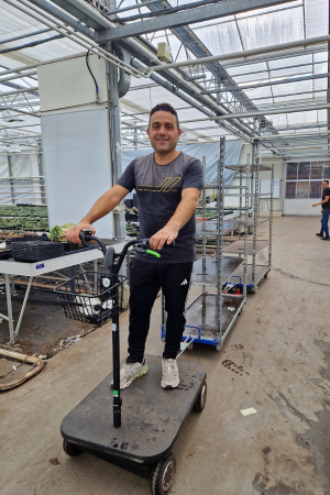 Steef Adrichem van Ansu Vanda beaamt dat zijn personeel met veel plezier gebruik maakt van de workstep. "Wij kwamen Johan tegen op een beurs in Gorinchem en waren gelijk enthousiast. We hebben een groot bedrijf met lichte producten en vaak kleine bestellingen, waar dit karretje ideaal voor is. We hebben er toen een paar gekocht en gevraagd aan het personeel om ze te gebruiken, maar dat was in het begin even een stap voor de medewerkers. Na een paar weken wilde iedereen het gebruiken en inmiddels hebben we flink uitgebreid, want als er geen beschikbaar is voor één van de dames, zijn ze niet blij," lacht Steef. "Het geeft veel werkvreugde, het is leuker om een eind met zo'n elektrisch karretje een aantal dozen op te halen dan wanneer je een eind moet lopen. Met een verjaardag op het bedrijf kan je ervan uitgaan dat we z'n allen op de workstep in een parade door de kas gaan."