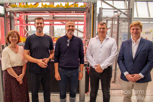 Mia Demeulemeester (directeur van Inagro), Maarten Ameye (onderzoeker bij Inagro), Bart Naeyaert (gedeputeerde van de provincie West-Vlaanderen), Jean-Pierre Coene (CEO) en Maarten Vandecruys (COO) bij Urban Crop Solutions.