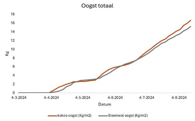 De eerste periode lag de oogst op steenwol en kokos min of meer gelijk, met een kleine voorsprong voor kokos. Het vruchtgewicht lag net hoger op de Forteco Profit matten en balanceerde rond de 200 gram. "De afgelopen weken zien we dat de oogst van het gewas op kokos duidelijk hoger ligt dan op steenwol. Hoewel de planten op steenwol tot nu toe steeds iets langer waren, is de lengtegroei van de planten op steenwol verminderd, waardoor de planten op beide substraten nu even lang zijn."