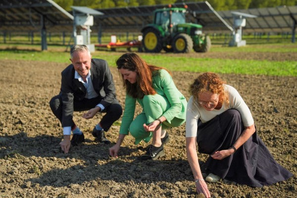 Olof van der Gaag (voorzitter NVDE), Annemarie Schouten (head Solar Development Vattenfall Nederland) en Rosemarie Slobbe (directeur Hemus) zaaien het eerste gewas tijdens de opening van het park. Foto: Futur Fox/Nelson Rodrigues