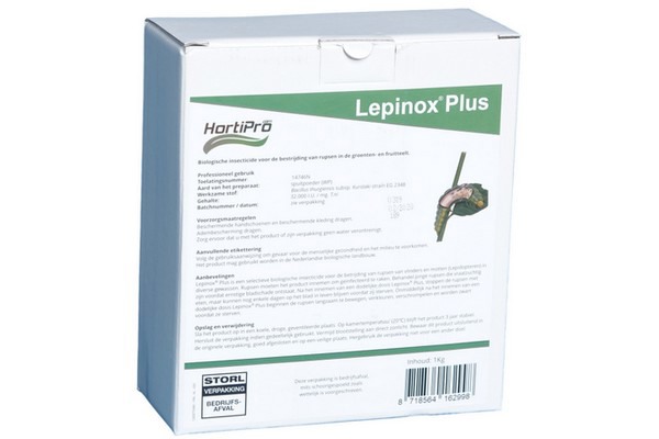 Om de effectiviteit van Lepinox Plus te vergroten, wordt aanbevolen om HelioTerpen Film in een dosering van 150ml op 100 ltr water aan de spuitoplossing toe te voegen. HelioTerpen Film is een speciale 100% natuurlijke hechter/ uitvloeier. Helioterpen Film zorgt ervoor dat het gewas langer nat blijft, wat de werkzaamheid van Lepinox Plus verbetert en fungeert daarnaast als een UV-filter. Hierdoor wordt de werkzame stof (Bt) minder snel afgebroken door UV-straling, wat de effectiviteit van Lepinox Plus verhoogt. Deze combinatie zorgt ervoor dat de bestrijding van jonge rupsen in het juiste stadium plaatsvindt en langer effectief blijft.