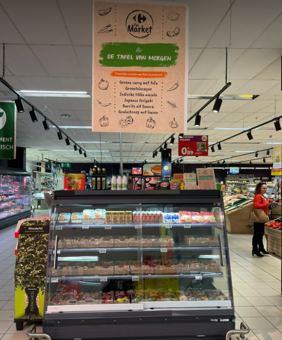 Sinds 2023 zijn de veggie-producten geïntegreerd in de verschillende afdelingen en duidelijk gemarkeerd om ze beter zichtbaar te maken. Zo kunnen flexitarische klanten gemakkelijk alle beschikbare alternatieven ontdekken tijdens hun winkelbezoek. De vegetarische producten van het merk Carrefour en van nationale merken zijn beschikbaar in de hele winkel: in de slagerij, vleeswaren, kaas, kant-en-klaarmaaltijden, smeersels en sauzen.