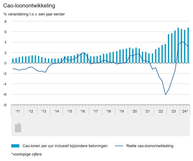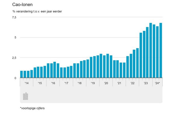 In het derde kwartaal van 2024 namen de cao-lonen (per uur inclusief bijzondere beloningen) met 6,8 procent toe ten opzichte van hetzelfde kwartaal een jaar eerder. Dit is even hoog als in het laatste kwartaal van 2023. Toen was de cao-loonstijging het hoogst in ruim veertig jaar. Dit meldt het CBS op basis van nieuwe cijfers.