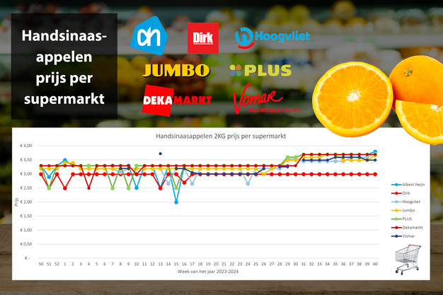 De appeltjes van oranje worden duurder in week 40. Albert Heijn, Hoogvliet en Jumbo verhogen de prijzen voor twee kilo handsinaasappelen met respectievelijk 10, 12 en 16 cent.