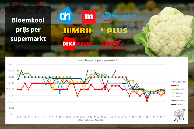 De vaste prijzen voor bloemkool zetten bij veel retailers een daling in. Albert Heijn, Hoogvliet, Jumbo en DekaMarkt verlagen de prijzen met respectievelijk 14, 4, 4 en 10 cent. Jumbo is met hun nieuwe vaste prijs nog 10 cent duurder dan Albert Heijn.