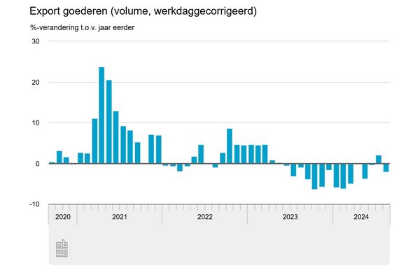 Het volume (werkdaggecorrigeerd) van de goederenexport was in augustus 2,1 procent kleiner dan in augustus 2023, meldt het CBS. Vooral de uitvoer van machines, aardolieproducten en transportmiddelen was lager. Het volume van de goederenimport was in augustus 0,2 procent kleiner dan in augustus 2023. In de CBS Exportradar van oktober waren de omstandigheden voor de export ongunstiger dan in de radar van augustus.