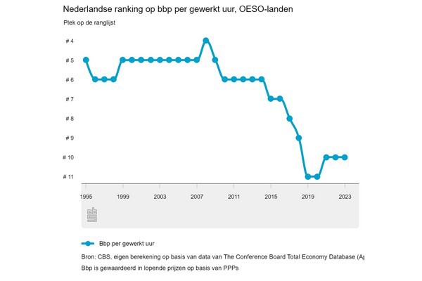 De groei van de Nederlandse arbeidsproductiviteit vertraagde in het afgelopen decennium sterker dan in andere hoge-inkomenslanden, waardoor Nederland afzakte op de ranglijst van bruto binnenlands product (bbp) per gewerkt uur. Deze ontwikkeling is grotendeels te verklaren door een verschuiving van arbeid naar minder productieve bedrijfstakken en het afschalen van de gaswinning in Groningen. Dat blijkt uit het artikel 'Achtergrond bij de daling van de arbeidsproductiviteitsgroei van Nederland' dat het CBS publiceert.