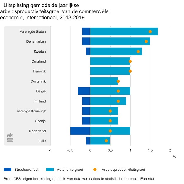 In de periode 2013-2019 zorgde het structuureffect jaarlijks voor ongeveer een 0,5 procentpunt vertraging van de arbeidsproductiviteitsgroei. In andere hoge-inkomenslanden speelden deze effecten vaak ook een negatieve rol, maar niet zo sterk als in Nederland.
