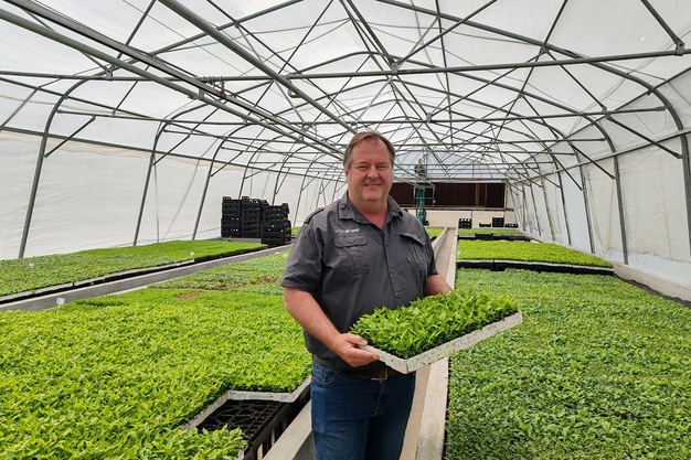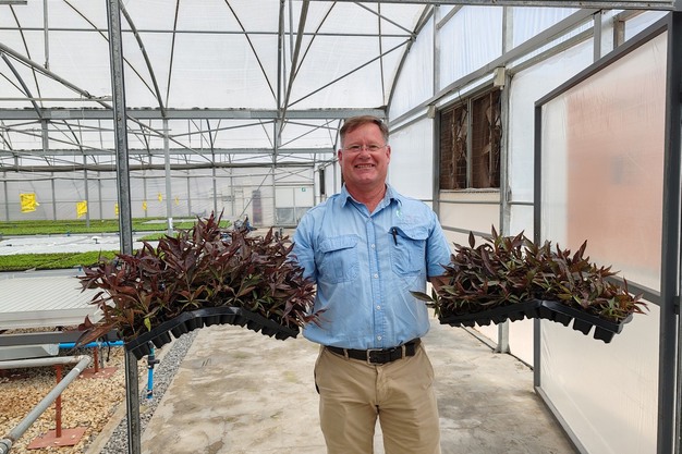 Frederik Voigt in de tunnel voor jonge planten, waar optimale groeiomstandigheden worden gehandhaafd