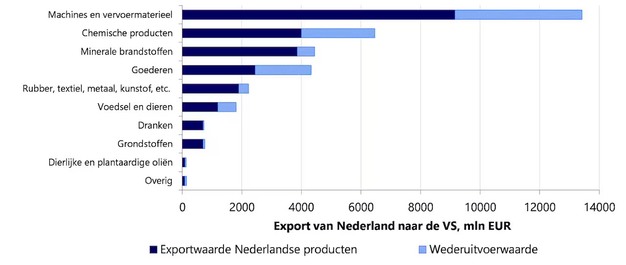Nederland heeft relatief sterke handelsbetrekkingen met de VS. Gecorrigeerd voor wederuitvoer is de VS de vierde markt als het gaat om de export van Nederlandse goederen in 2023, met een waarde van 24 miljard euro (zie figuur 1). Daarmee is de Amerikaanse markt voor Nederland een belangrijkere exportmarkt dan bijvoorbeeld Frankrijk, Italië, Spanje of China. Nederland exporteert naar de VS vooral machines, chemische producten en minerale brandstoffen (zie figuur 2).