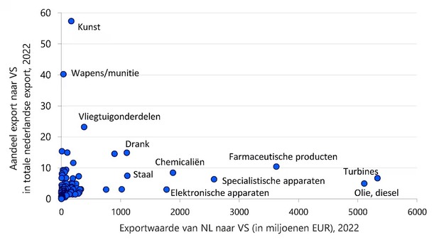 In figuur 3 staat op de verticale as de Nederlandse exportwaarde in een bepaalde productcategorie in verhouding tot de totale Nederlandse export in die categorie. Ter illustratie: van de totale mondiale Nederlandse vliegtuigonderdelenexport gaat bijna een kwart naar de VS. Op de horizontale as staat de exportwaarde, die weergeeft hoe groot de exportmarkt is voor een specifieke productcategorie. De Nederlandse export van kunst, wapens, vliegtuigonderdelen en drank (onder andere bier) is sterk geconcentreerd richting de Amerikaanse markt. Dat terwijl qua exportmarktomvang chemicaliën, elektronische apparaten, specialistische apparaten, farmaceutische producten, turbines en olie en diesel belangrijk zijn. Ook is het vanuit de kwetsbaarheid voor protectionistisch beleid belangrijk om in het achterhoofd te houden of een product gemakkelijk te substitueren is op de binnenlandse markt zodra er extra tarieven op geheven worden. Dat zal bij homogene producten, zoals drank of bepaalde basischemicaliën, sneller het geval zijn dan bij specifieke niche-onderdelen of unieke eindproducten, zoals specialistische medische apparaten of een EUV-lithografiemachine van ASML.