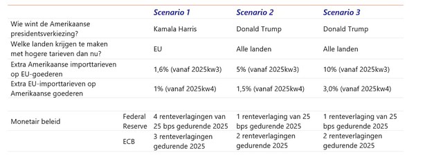 - Scenario 3: Donald Trump wint de Amerikaanse verkiezingen en voert in 2025 een extra universeel invoertarief in van 10%.