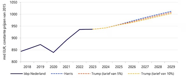 - Scenario 2: Donald Trump wint de Amerikaanse verkiezingen en voert in 2025 een extra universeel invoertarief in van 5%.