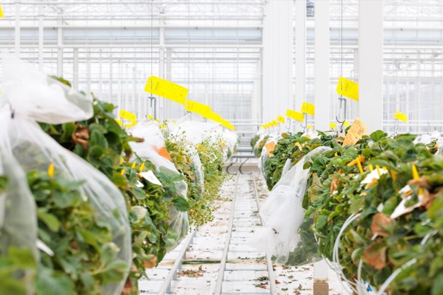 Een veredelingsproef van aardbei in Rijk Zwaan's nieuwe veredelingskas in Dinteloord