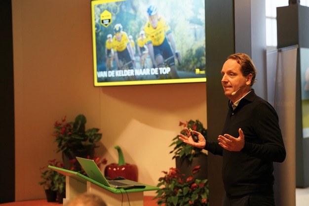 Robert Solleveld tot slot namens Glastuinbouw Nederland na alle sectorpresentaties gastspreker Merijn Zeeman aankondigen. Hij was tot 1 oktober sportief directeur van wielerploeg Visma Lease a Bike, en haar voorgangers, en is per 1 december algemeen directeur bij voetbalclub AZ. Merijn vertelde over hoe de wielerploeg vanuit de kelder naar de top opklom, en hoe hij daar met het team stappen voor heeft gezet.