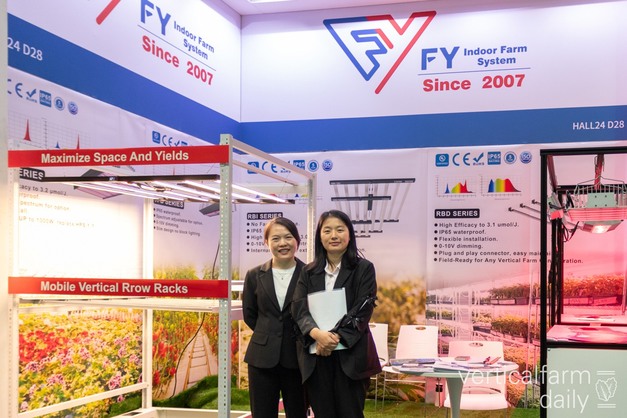 Cherry Yu en Bobo Yee van Indoor Farms YS toonden hun verticale rekken met geïntegreerde belichting