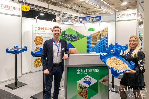 Bob Persoon en Annet van der Ven van Beekenkamp BV laten insectenkratten zien in plaats van verpakkingen voor de tuinbouw, waar het bedrijf ook in gespecialiseerd is