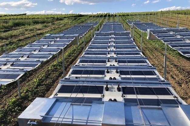VitiCult project in Geisemheim, Duitsland, met gebruik van Mirai Solar's fotovoltaïsche zonweringssysteem (bovenaanzicht). Klik hier voor meer informatie.
