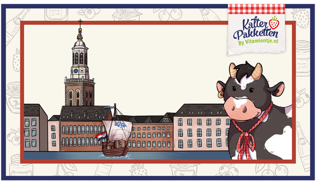 Beeldmerk Kalterpakketten met elementen uit de regio, zoals de Kamper koe, het IJsselfront van Kampen en de Kamper Kogge