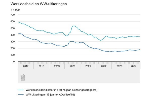 Het aantal WW-uitkeringen nam in oktober 2024 toe met 6,7 duizend naar 179,0 duizend. Dat is een stijging van 3,9 procent. Er kwamen in oktober 27,6 duizend nieuwe uitkeringen bij, en er werden 20,9 duizend WW-uitkeringen beƫindigd.