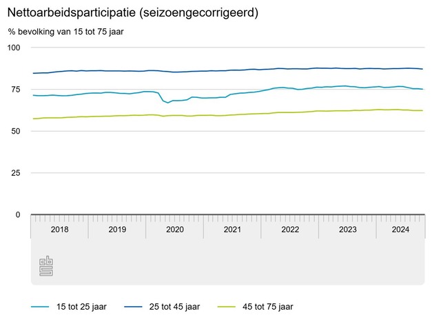 In de eerste helft van 2024 nam het percentage werkenden nog toe, tot 73,4 in juni. Vervolgens zette een daling in, naar 72,8 procent in oktober. Deze daling was bij alle leeftijdsgroepen te zien, maar het sterkst bij 15- tot 25-jarigen. In het derde kwartaal daalde vooral het aantal werkenden met minder complexe taken. Bij beroepen met complexe of zeer complexe taken nam het aantal werkenden nog toe.