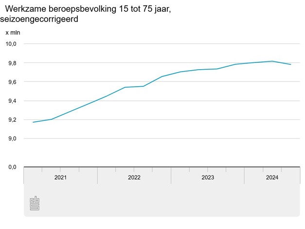 Voor het eerst na de coronacrisis is de groei van de werkzame beroepsbevolking gestopt. In het derde kwartaal van 2024 nam deze af met 34 duizend ten opzichte van het voorgaande kwartaal. Vooral bij beroepen met minder complexe taken nam het aantal werkenden af. Dit blijkt uit nieuwe cijfers van het CBS.