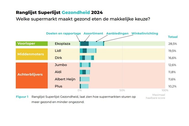 72% van de Nederlanders vindt het volgens Questionmark belangrijk dat supermarkten hun klanten stimuleren om een gezonde keuze te maken. De Superlijst Gezondheid 2024 beoordeelt supermarkten op vier domeinen: beleidsdoelen, assortiment, aanbiedingen en winkelinrichting. Ekoplaza onderscheidt zich met een assortiment dat binnen de onderzochte productgroepen voor 50% binnen de Schijf van Vijf valt en de keuze voor dit systeem boven de Nutri-Score. Ook loopt Ekoplaza net als twee jaar geleden voorop in zout- en suikerreductie.