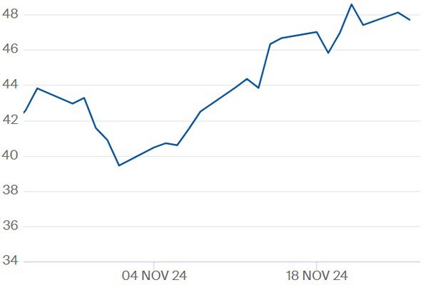 Zonder echte kou en zonder bijzondere warmte, en dankzij genoeg wind, stijgt de TTF-gasprijs deze week voorlopig niet verder door. Woensdagochtend liggen de contractprijzen voor deze winter in de range van 46 euro per megawattuur, daar waar recent nog de 50 euro leek te worden aangetikt. Van een echte daling van de gasprijs is desalniettemin ook niet echt sprake. Aanhoudende geopolitieke zorgen en felle concurrentie om LNG zorgen hiervoor.
