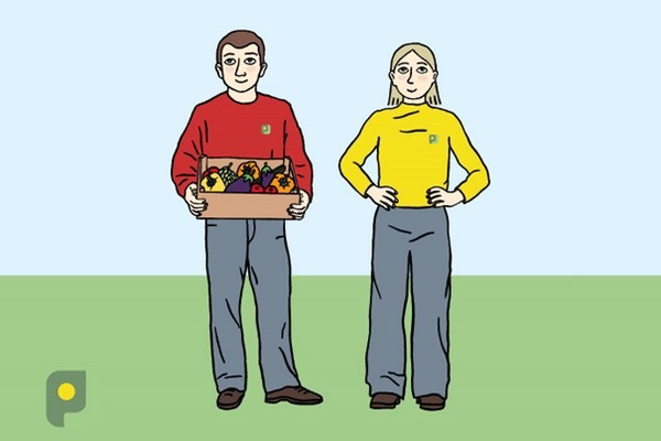 De tuindersman, in rode trui, en de tuindersvrouw, in het geel, gaan telers die met het modelgebaseerde gewasplanningsplatform werken helpen om hun teeltplan uit te rekenen.