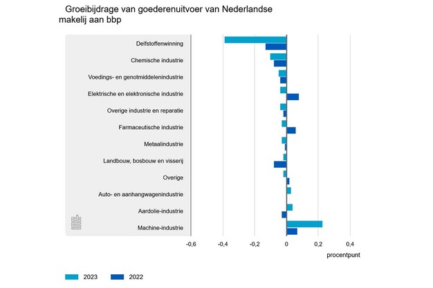 In 2023 groeide het bbp van Nederland met 0,1 procent. De uitvoer van goederen en diensten droeg hier met 0,3 procentpunt negatief aan bij. De bijdrage van Nederlandse makelij in de uitvoer daalde, waarbij de lagere productie en export van aardgas een grote rol speelde. Dit meldt het CBS op basis van nieuwe cijfers.