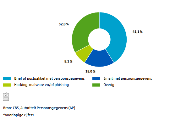 Daarnaast kan het bij de overige incidenten (33 procent) gaan om onder andere persoonsgegevens die zijn toegevoegd aan een verkeerd dossier, persoonsgegevens van een klant die zijn getoond in het verkeerde klantportaal, of om een usb-stick of papier met persoonsgegevens dat is kwijtgeraakt.