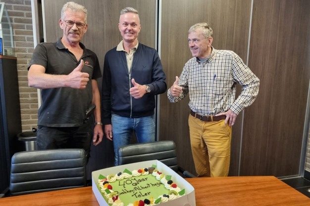 Vrijdagochtend is tomatenteler Koos van der Burg 'aangenaam verrast' door een delegatie van Bakker Barendrecht. "Zij hadden een feestelijke taart bij zich vanwege het feit dat ik dit jaar reeds 40 jaar teel voor Bakker/AH."