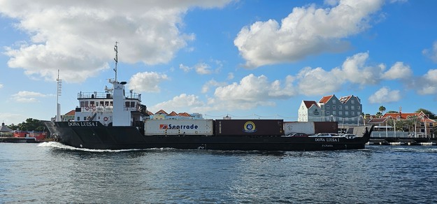De overgeladen containers voor Bonaire worden in Curaçao op een chassis gezet en daarna naar het eiland gevaren omdat ze er zelf geen kraan hebben