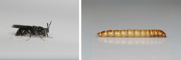 Zwarte soldatenvlieg (links) en meelworm (rechts). Foto: © Inagro